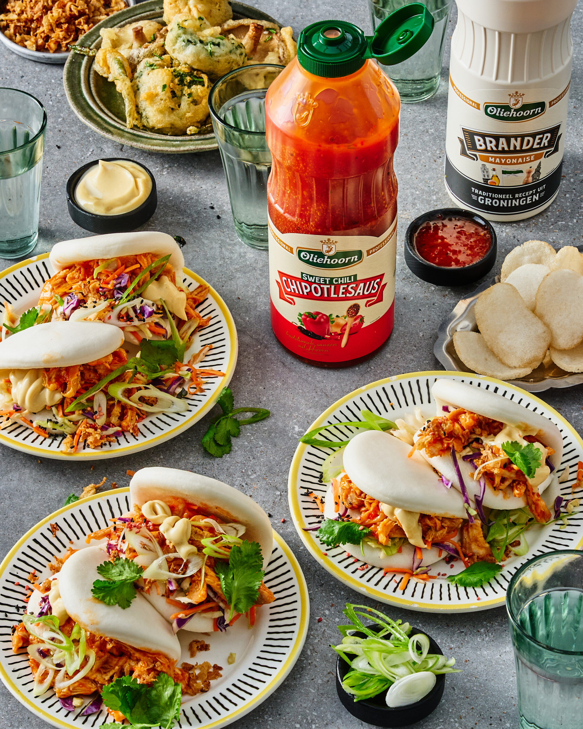 Bao buns pulled chicken met Brander en Sweet Chili Chipotle