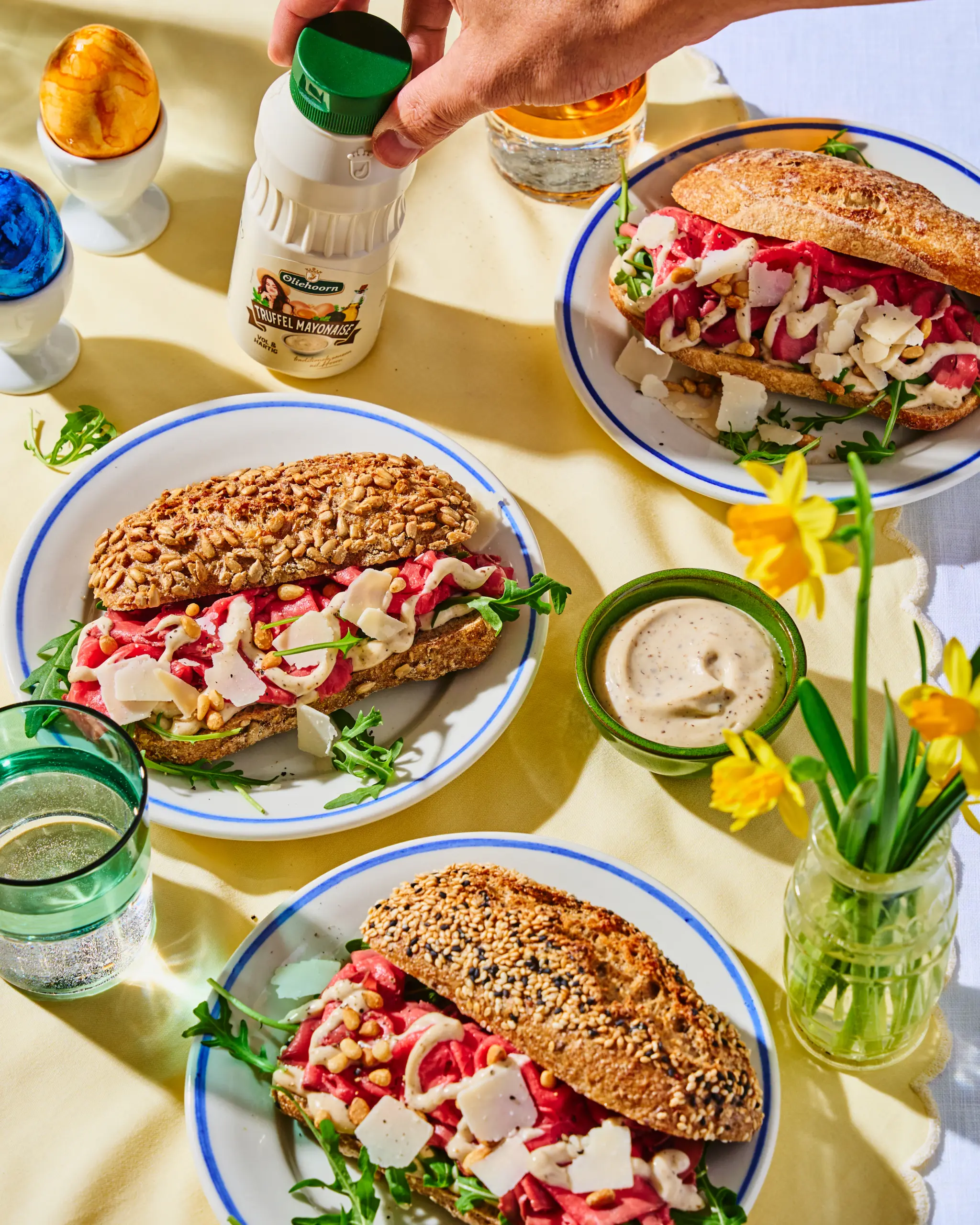 Perfect voor een luxe Paasbrunch! Vers broodje rosbief met romige truffelmayonaise, geroosterde pijnboompitten en Parmezaanse kaas. Een smaakvolle combinatie. Makkelijk te maken maar moeilijk te weerstaan.