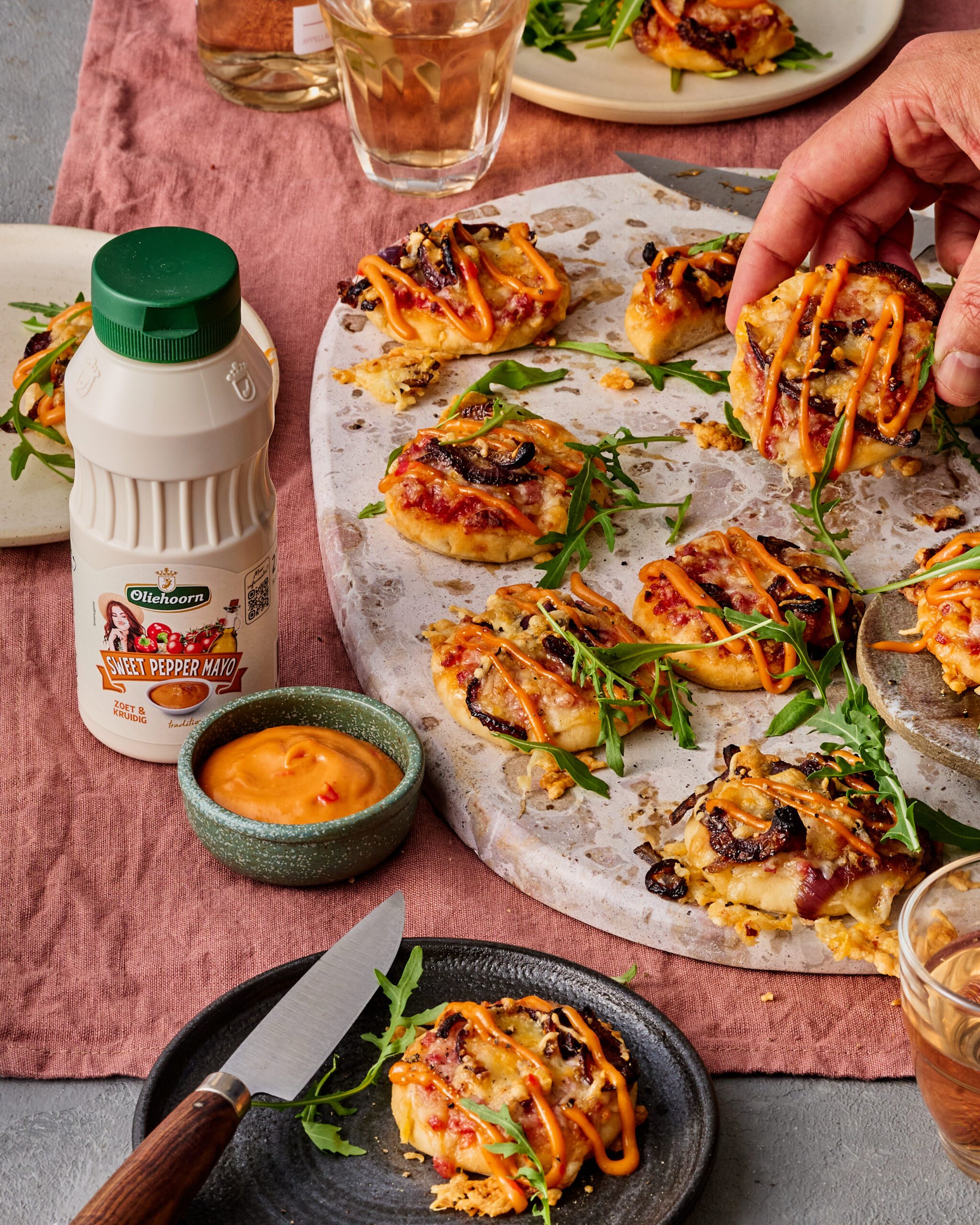 Mini pizza met gekarameliseerde ui en Sweet Pepper Mayo